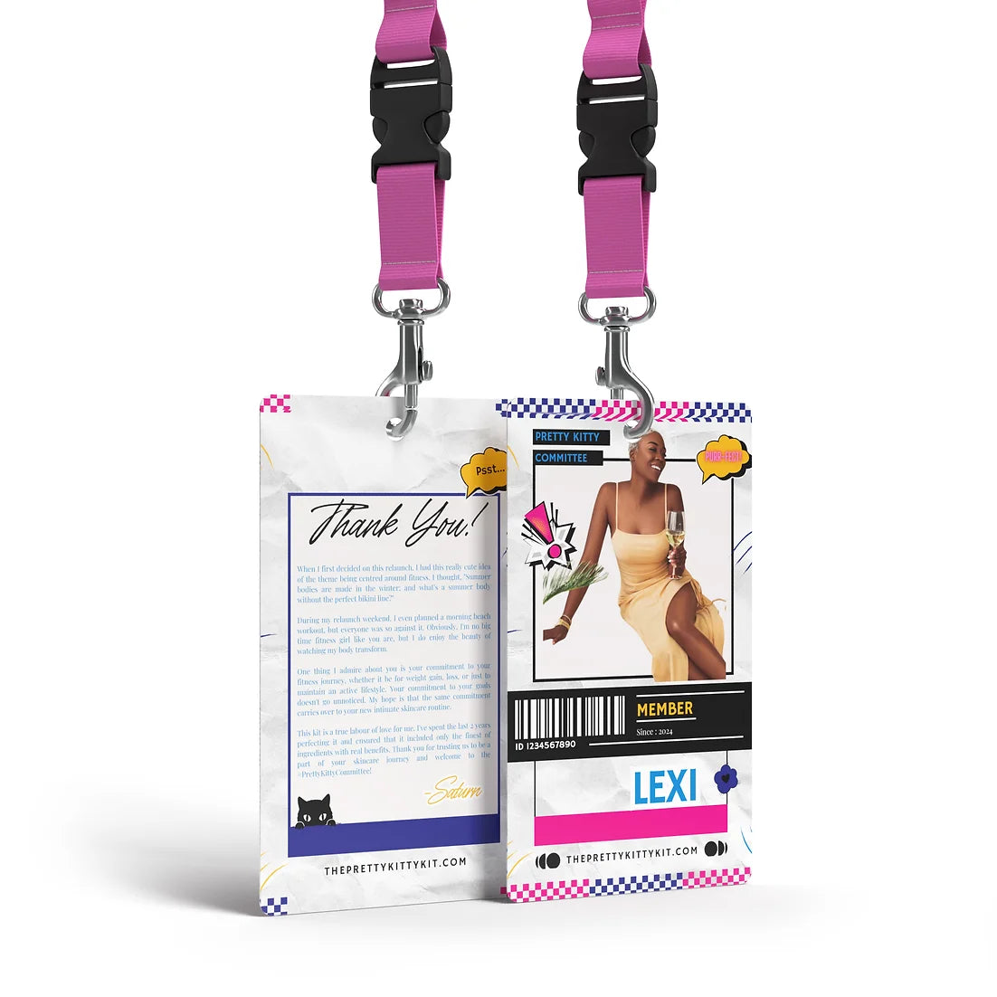 Exclusive Offer: With this option, you will receive a customized lanyard featuring your photo, officially designating you as a member of the Pretty Kitty Committee. Show off your exclusive status and enjoy the added touch of personalized luxury with your kit!